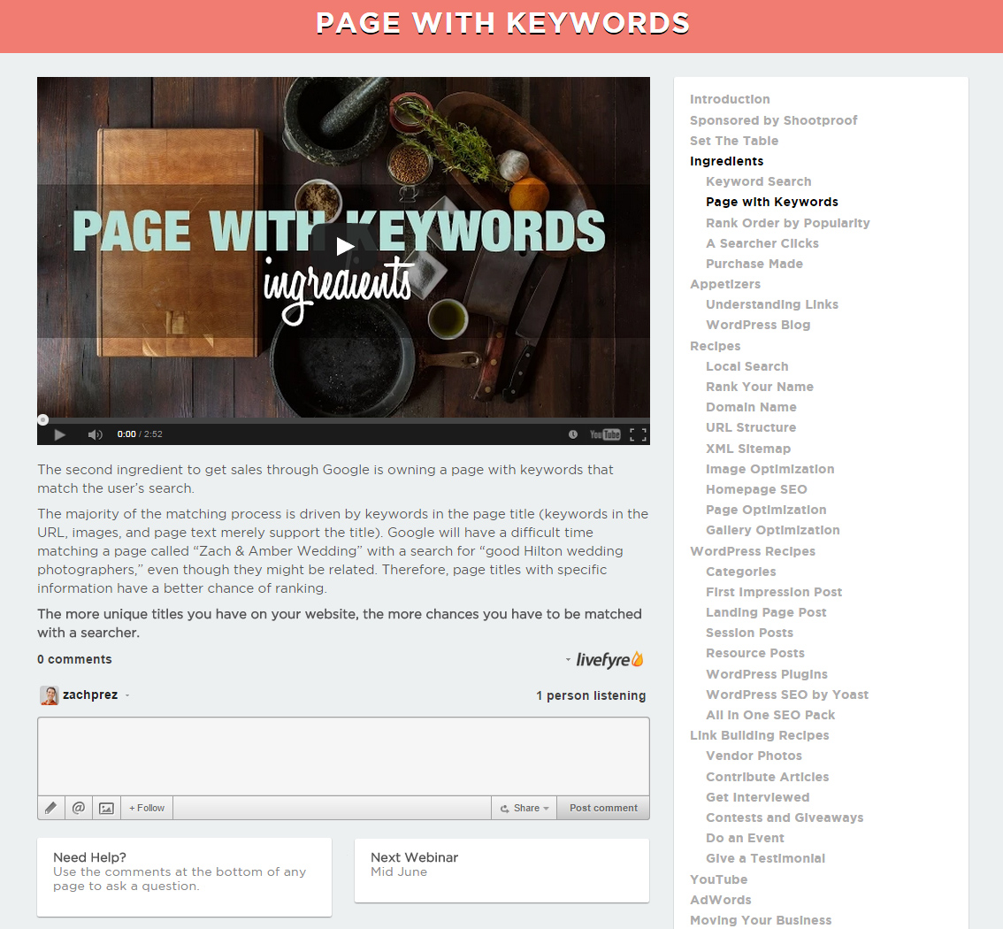 Upgrade to the SEO Cookbook Course to learn through video screen sharing. Every appetizer and recipe has a video where I’ll talk you through what to do and show examples. The Course is your best option for understanding the critical success factors in search. Here’s what the course looks like: